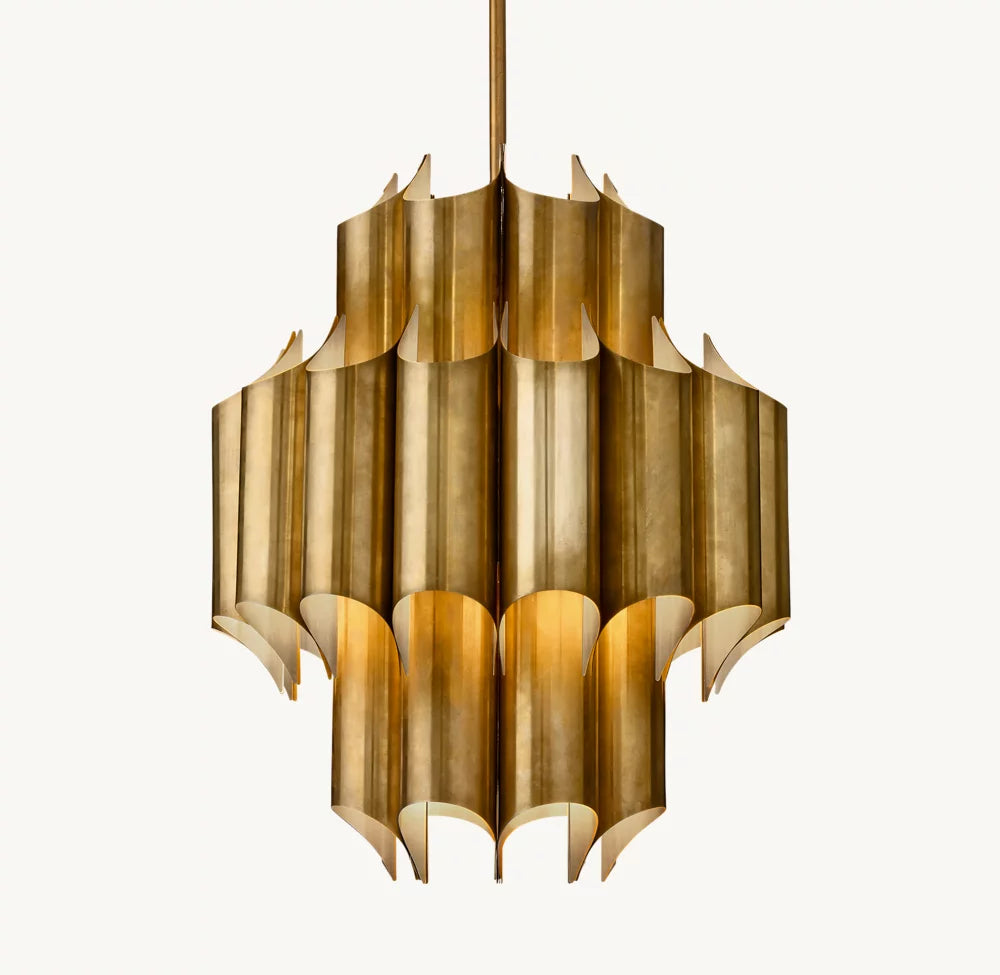 リボンのように波打つ真鍮板が、ロバート・ソンネマンのシャンデリアにシンプルでありながら視覚的に複雑な表情を与えます。ミッドセンチュリーを代表するデザインであり、この彫刻的な照明器具は、従来のシャンデリアの概念を現代アートのオブジェとして昇華させます。