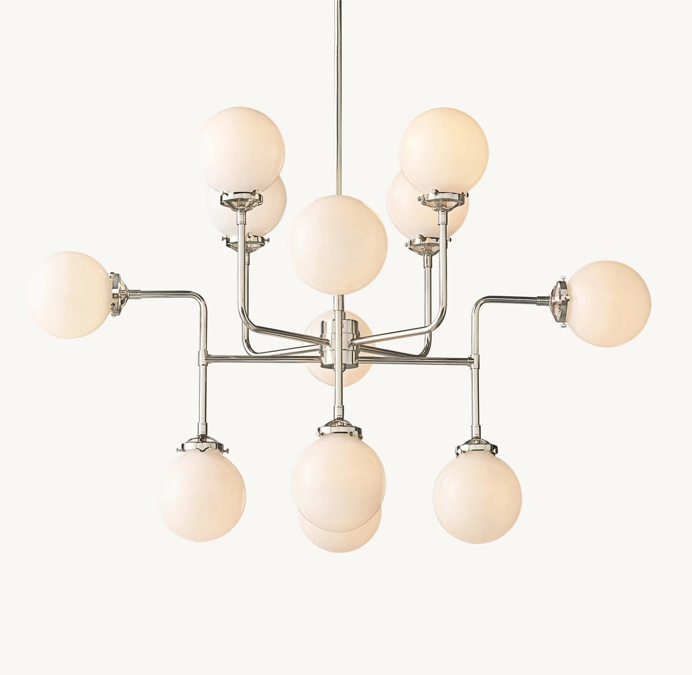 1940年代のインダストリアルデザインに着想を得たグローブシャンデリア。都市の地下鉄路線図を思わせる直線と球体の組み合わせが特徴です。12個のガラスシェードがメタルチューブで接続され、縦方向のスレッドロッドによってバランスよく配置されています。